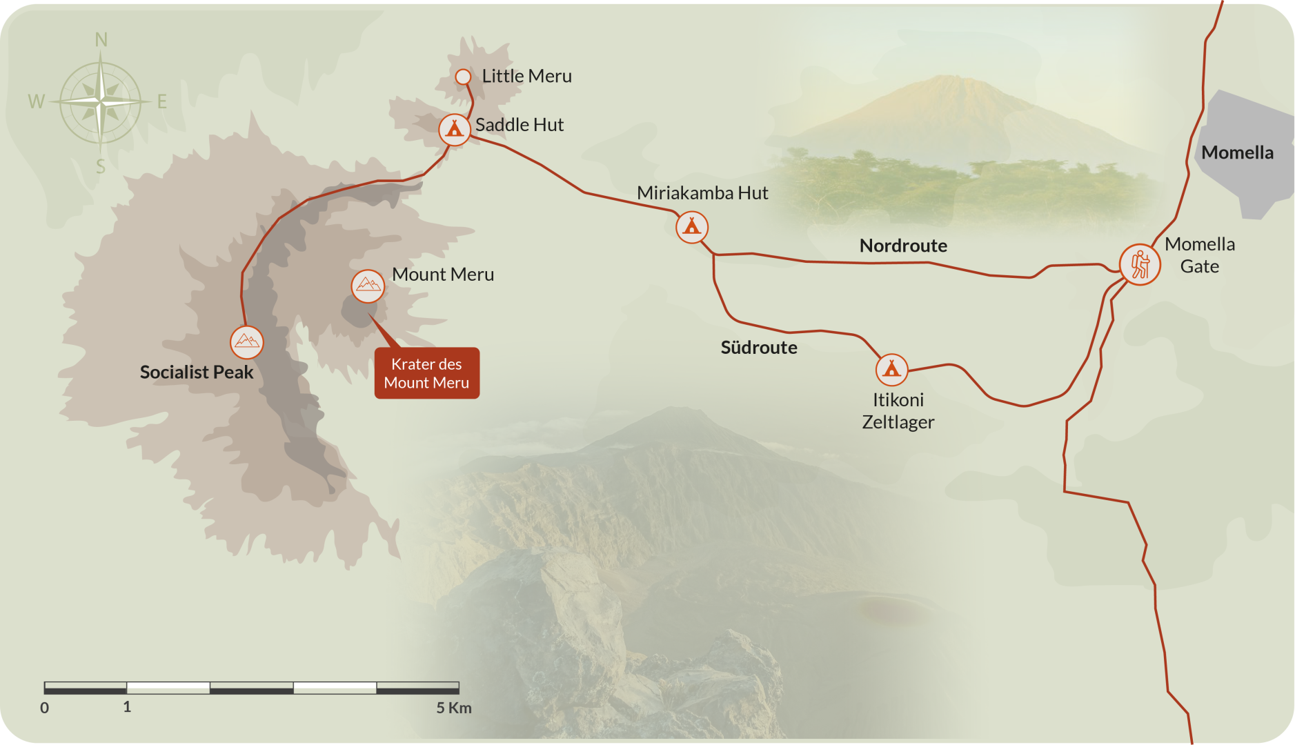 Beschreibung: Der Gipfelaufstieg beginnt früh am Morgen. Über steile und felsige Pfade erreichst du den Socialist Peak, den höchsten Punkt von Mount Meru, und genießt einen atemberaubenden Sonnenaufgang mit Blick auf den Kilimanjaro. Der Abstieg führt zurück zur Miriakamba-Hütte.
