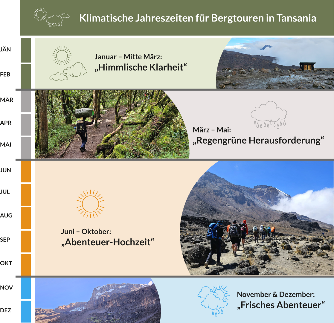 Die kurze Regenzeit bringt erfrischende Regenschauer und eine außergewöhnliche Ruhe auf den Berg. Für erfahrene Wanderer, die ein einmaliges und ruhiges Erlebnis suchen, ist diese Saison ein Geheimtipp.