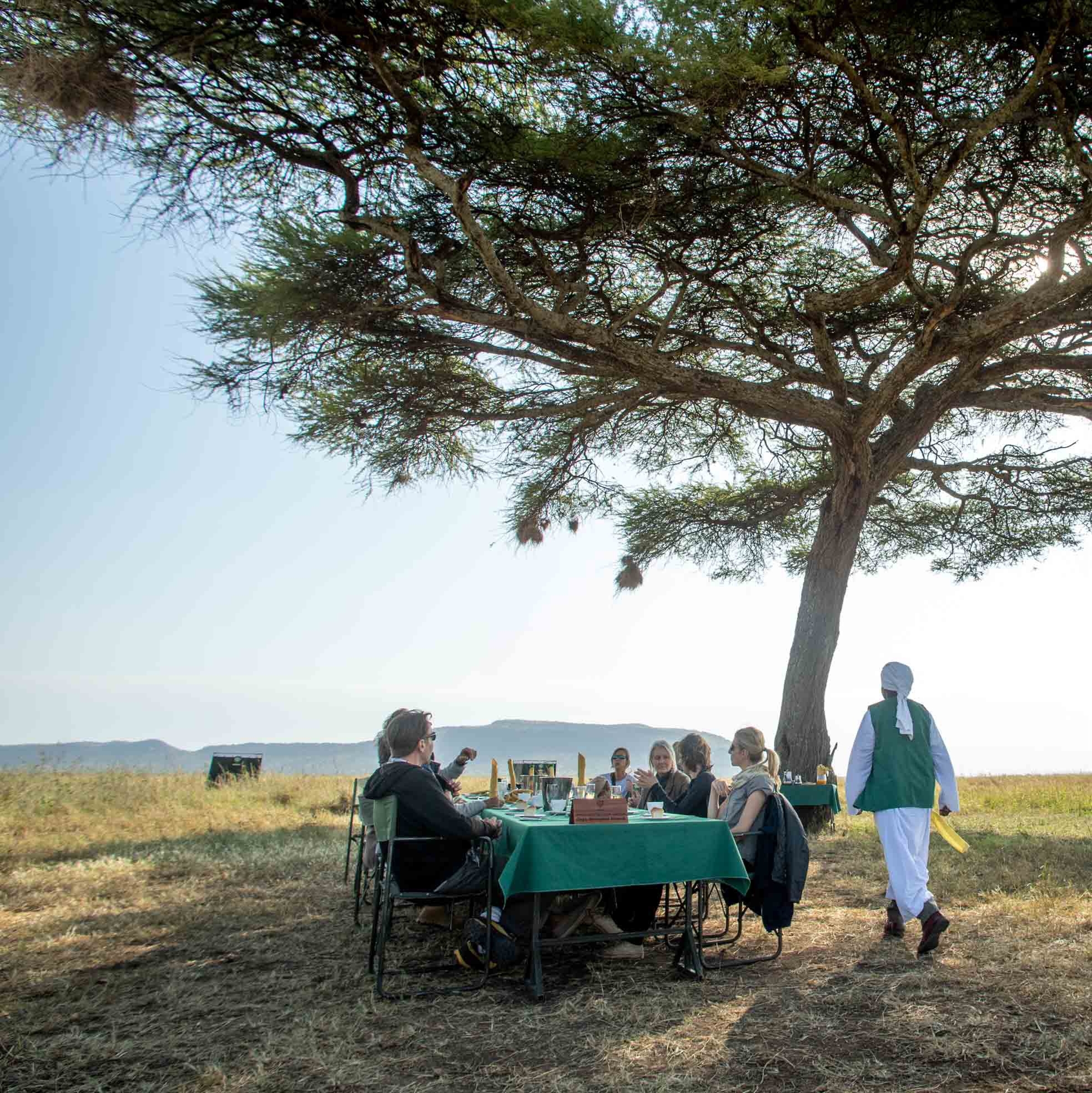 After landing, the balloon ride is traditionally celebrated with a glass of champagne. Subsequently, you will be treated to a freshly prepared breakfast in the midst of the wilderness in an elegant "Out of Africa" style. Various dietary options are available.