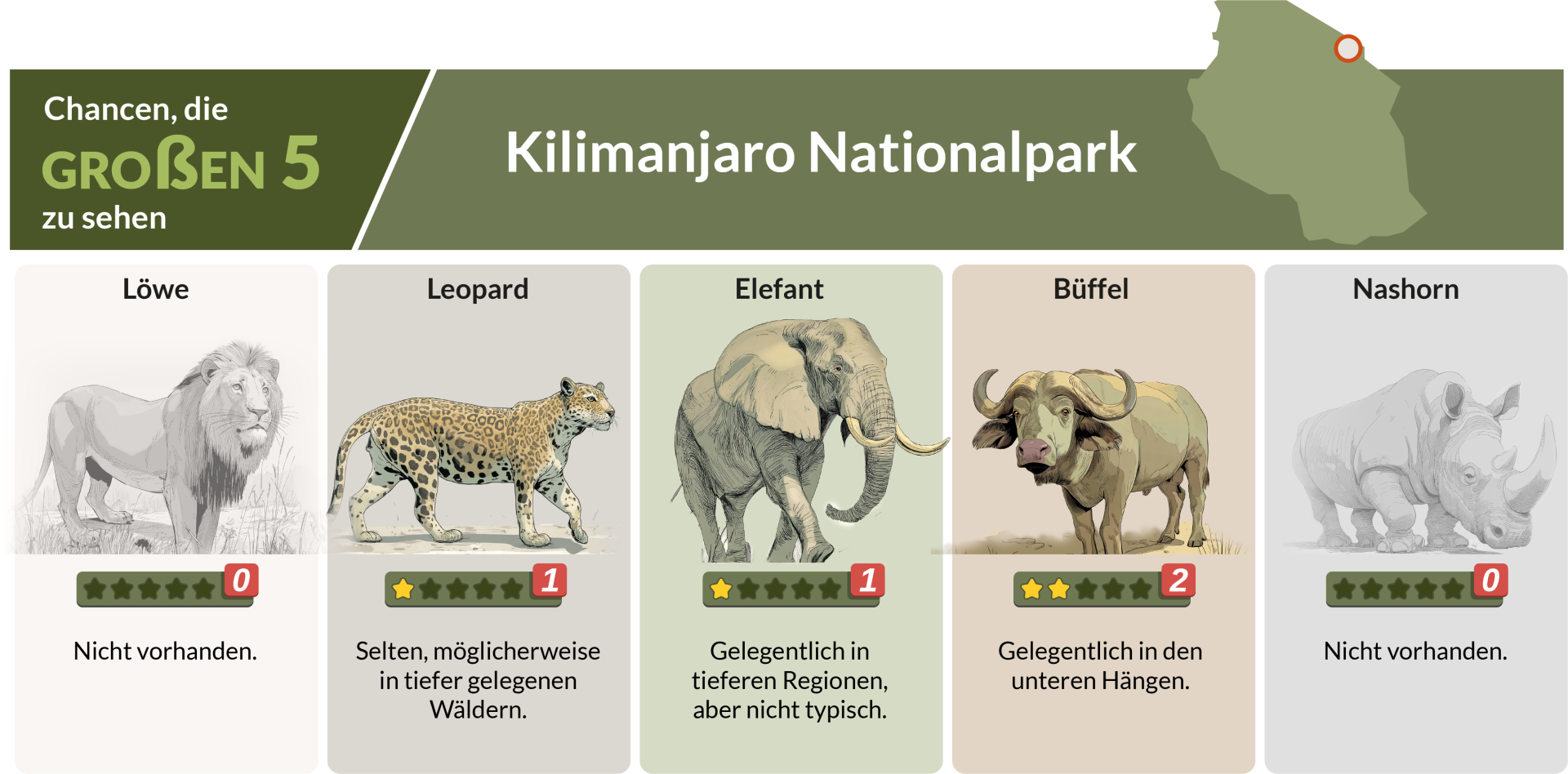 Auch wenn der Kilimanjaro primär als Bergsteigerziel bekannt ist, gibt es zahlreiche Möglichkeiten, die Wildtiere der Region zu entdecken.
