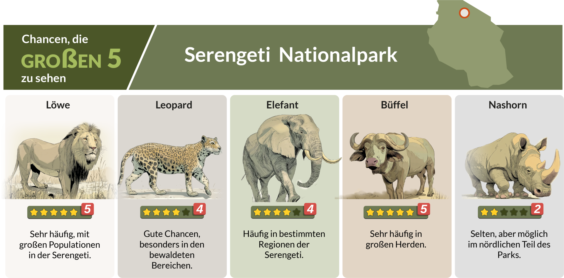 Geparden, Leoparden und Hyänen. Besonders die Löwenrudel der Serengeti