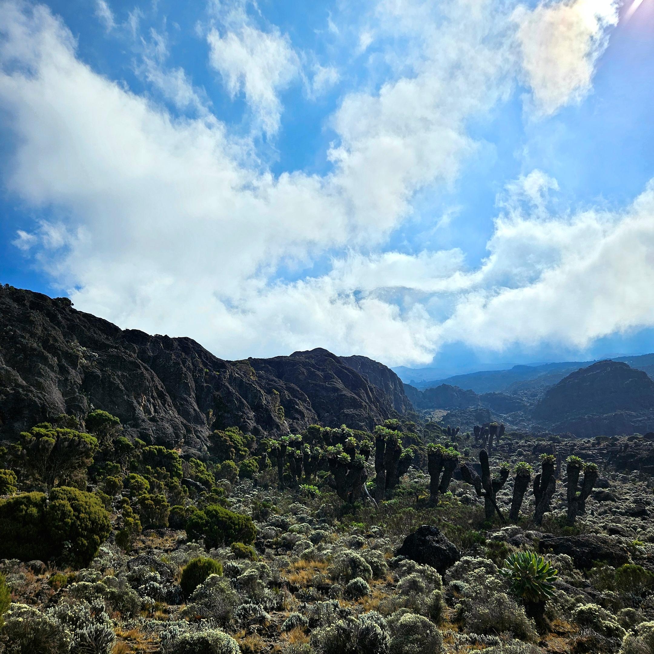 Beschreibung: Der Weg führt steil durch dichten Regenwald. Am Umbwe Camp angekommen, hast du die Baumgrenze erreicht, und die Vegetation weicht der Moorlandschaft. Das Camp bietet erste weite Ausblicke auf den Berg.